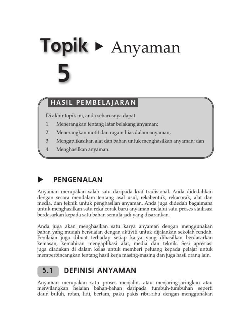ALAT YANG DIGUNA i. Anyaman dapat dibuat dari bahan alam seperti daun pandan daun lontar janur bambu dan rotan. Cara anyaman dimulakan bergantung pada jenis benda yang ingin dihasilkan serta corak hiasan yang dipilih.
